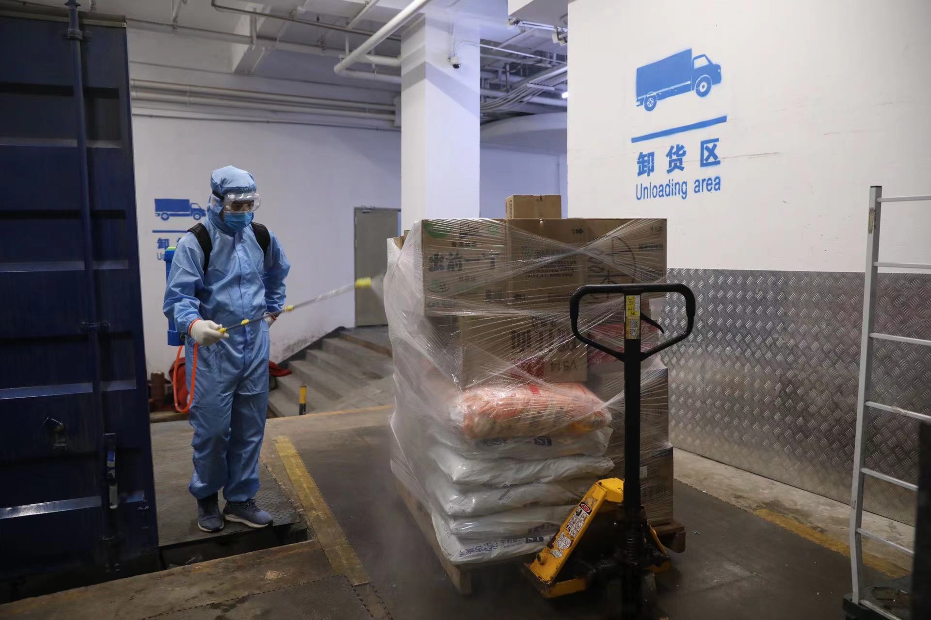4月11日凌晨,广州日报全媒体记者来到盒马西门口店看到,来自盒马不同仓库、供应商基地的多量货车陆续在卸货。工作人员首先对到达的商品进行消毒,随后入库,再陆续线上线下上架。