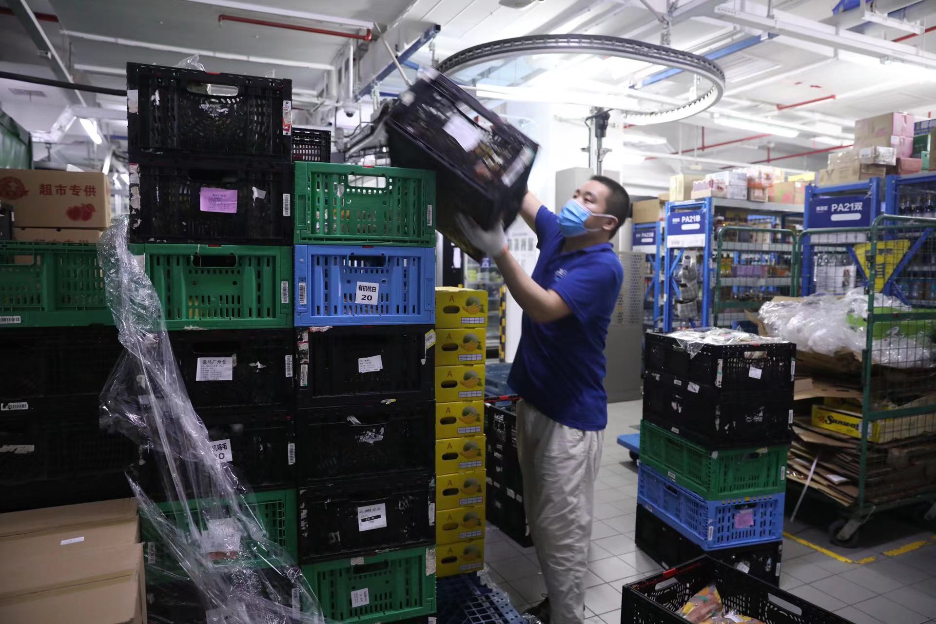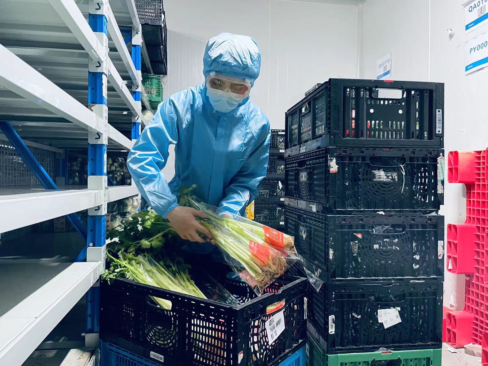 据了解,一般情况下,盒马西门口店一晚进货量是30多“卡板”货物,包括蔬菜肉类、禽肉奶制品,常温产品等。“这两天一晚要收60多’卡板’的货”,工作人员表示,其中主要是蔬菜,肉类进货量增加。