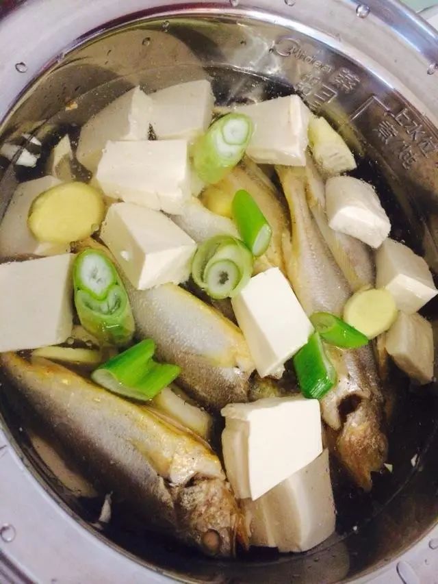 搭配清鲜脆爽的时令笋尖即成鲜美之极的笋尖豆腐清炖小黄鱼。