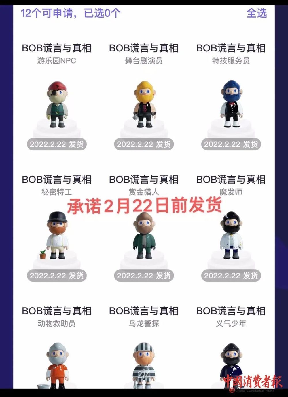 今年1月18日,陕西西安消费者张先生在盲盒星球小程序下单一整盒“BOB谎言与真相”系列盲盒,共12款,消费1205元,页面显示发货日期是2月22日。