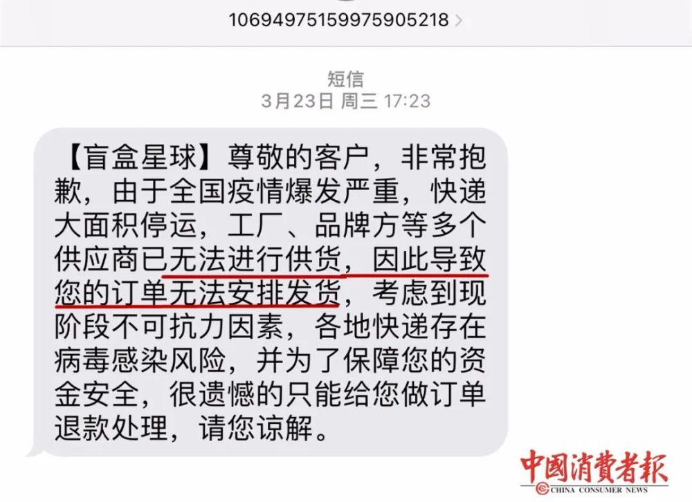 3月31日,盲盒星球官方微信公众号发布《致歉信》,表示:“盲盒星球下架了所有可能导致延期的商品,以确保目前在售商品都可以如期发货,不会再出现延期不发货的情况。”