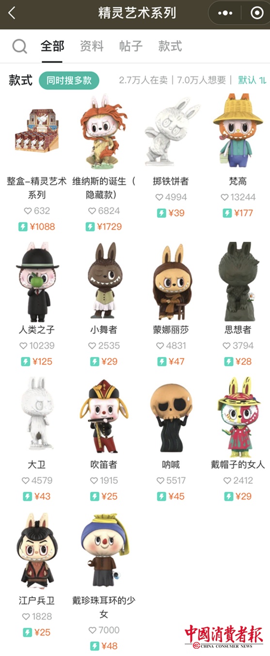 张先生:“这5个盲盒全部是雷款,其中4个在二级市场售价不超过100元,都低于官方售价。没发货的7个盲盒中,有3个热款,目前在二级市场溢价严重,售价3000多元到6000多元不等,远高于官方售价;另外4个盲盒在二级市场的售价也比官方售价高。”