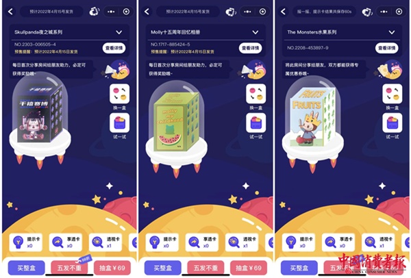 但盲盒星球维权群内湖南长沙消费者汤女士4月5日向记者反馈,她被退款的订单中泡泡玛特“The monster水果”系列、“Molly十五周年回忆相册”、“Skullpanda夜之城”系列仍然在盲盒星球小程序销售,并未下架。记者进入盲盒星球小程序浏览,看到汤女士提到的盲盒系列确实仍有销售。