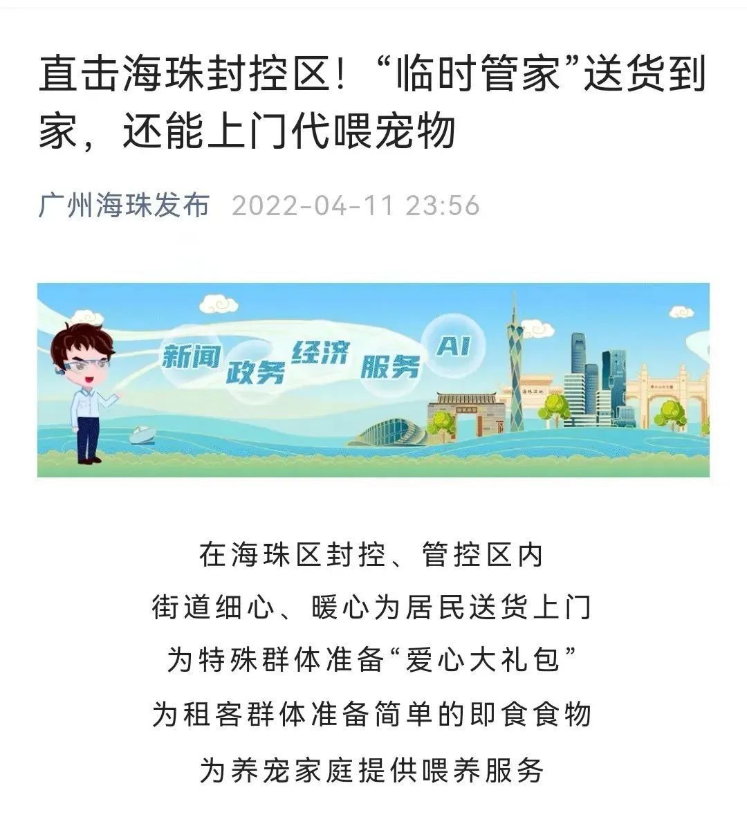 1、统筹协调越秀集团、岭南商旅集团、广州酒家3家市属国企做好对口支援街道保供,4月8日以来为重点管控区域供给保障粮油、蔬果、肉类、禽蛋等超63.4吨。