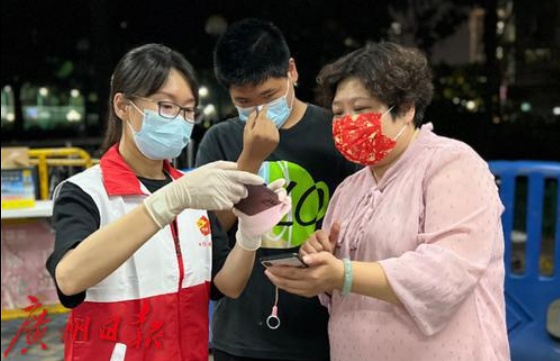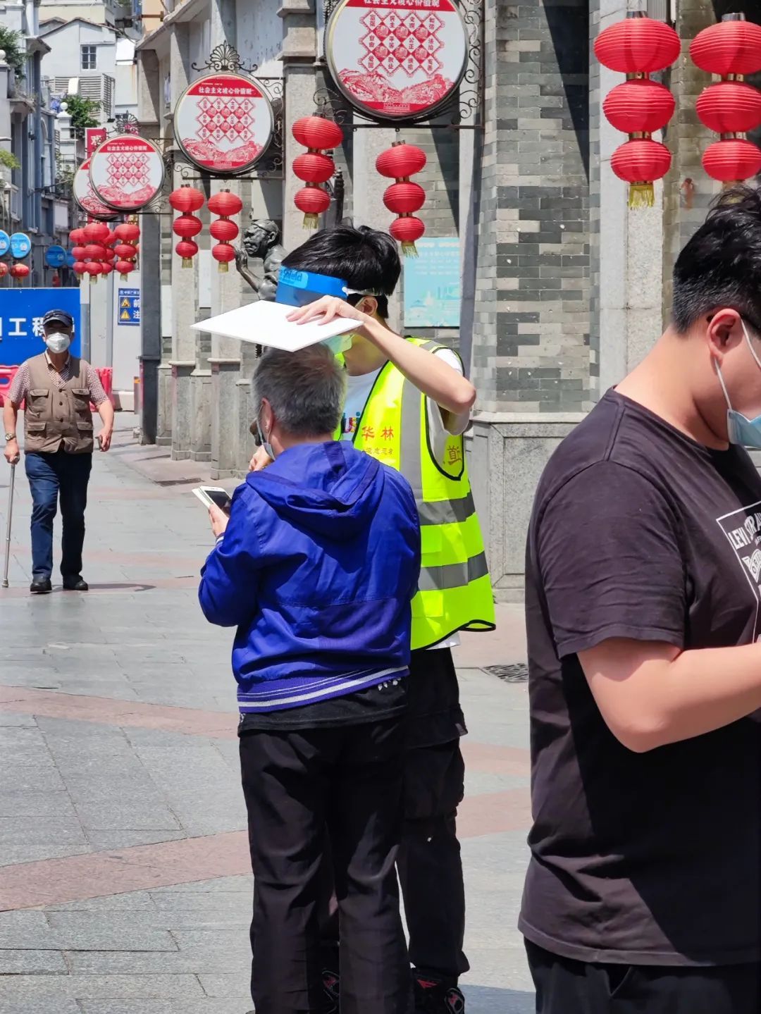 4月12日上午,荔湾区全员核酸平安大戏院检测点,一位老人家向志愿者咨询时,因担心天气太晒,志愿者主动用手上的纸板为老人遮阳。这一幕被吴小姐拍下并发在朋友圈,获得众多网友点赞。吴小姐表示,那一刻自己被暖到了,“小伙子看着白白净净的,应该平时也不怎么晒太阳,但为了做好志愿者的工作,愿意去帮助别人,这一幕真美!”