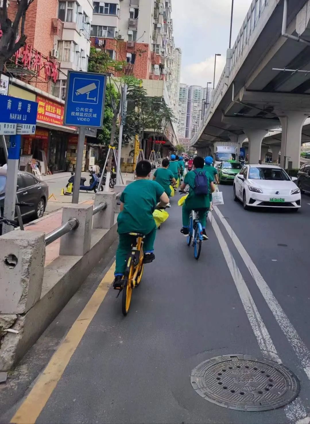 有为了节省时间骑着单车就奔赴核酸检测点的医护们