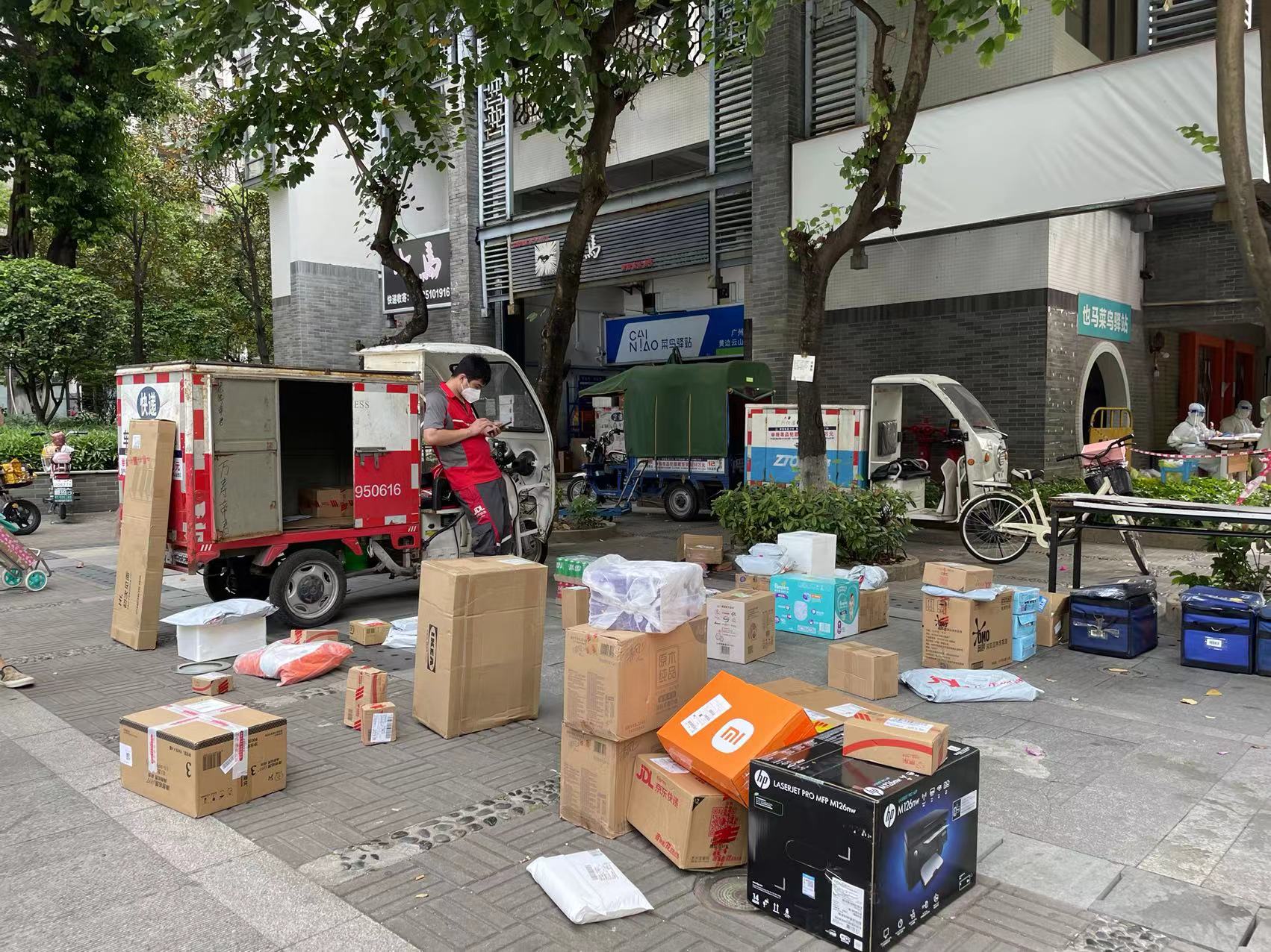 “靓女,有件要取吗?报下号码。”一位京东小哥对前来取快递的女士说。白云区永平街道云山诗意社区属于防范区,12日上午,广州日报全媒体记者看到,这里的快递小哥们三三两两分散在商业街正中央,各自划出一小块“天地”,等候着在附近做完核酸的居民顺道来取件。“不能送上门了,好在大家每天都要做核酸、会下楼来一趟,所以也没人抱怨。”一位快递小哥表示。与此同时,记者在也马驿站看到,一车一车的快递依然在有条不紊地卸货,居民们也是戴着口罩、自觉间隔一定距离排队,然后报收货码取件。