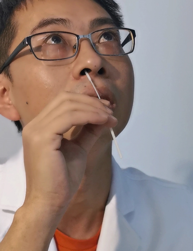 6.如有鼻涕,先擤鼻子,再微微仰头,把采样拭子放入鼻孔,慢慢推进至1.5厘米深左右,贴着鼻腔黏膜轻轻转动4圈,停留时间大于15秒(见下图);