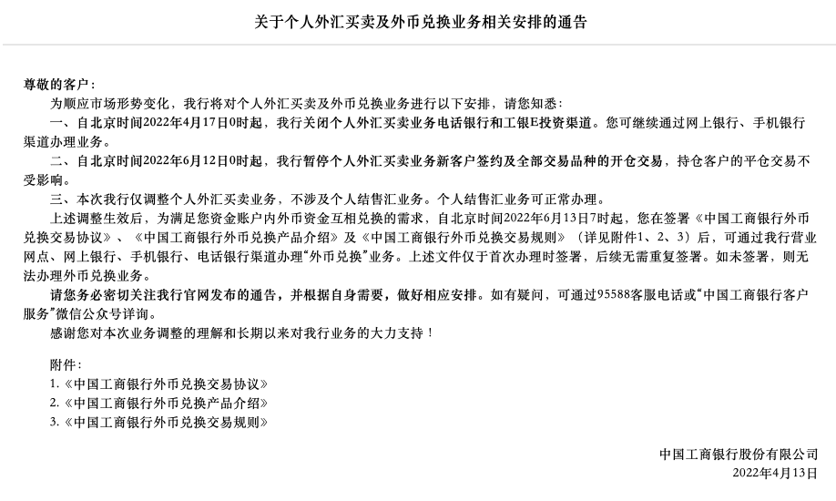 相关公告提出,工商银行自4月17日0时起,关闭个人外汇买卖业务电话银行和工银E投资渠道,不过保留网上银行、手机银行渠道办理业务。另外,自6月12日0时起,暂停个人外汇买卖业务新客户签约及全部交易品种的开仓交易,持仓客户的平仓交易不受影响。为满足客户资金账户内外币资金互相兑换的需求,6月13日7时起,客户必须签署相关文件后才可办理“外币兑换”业务。