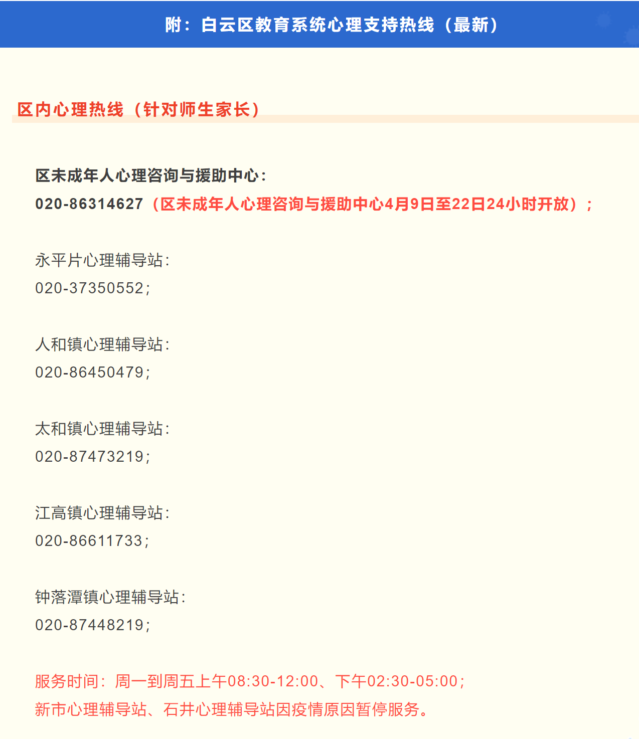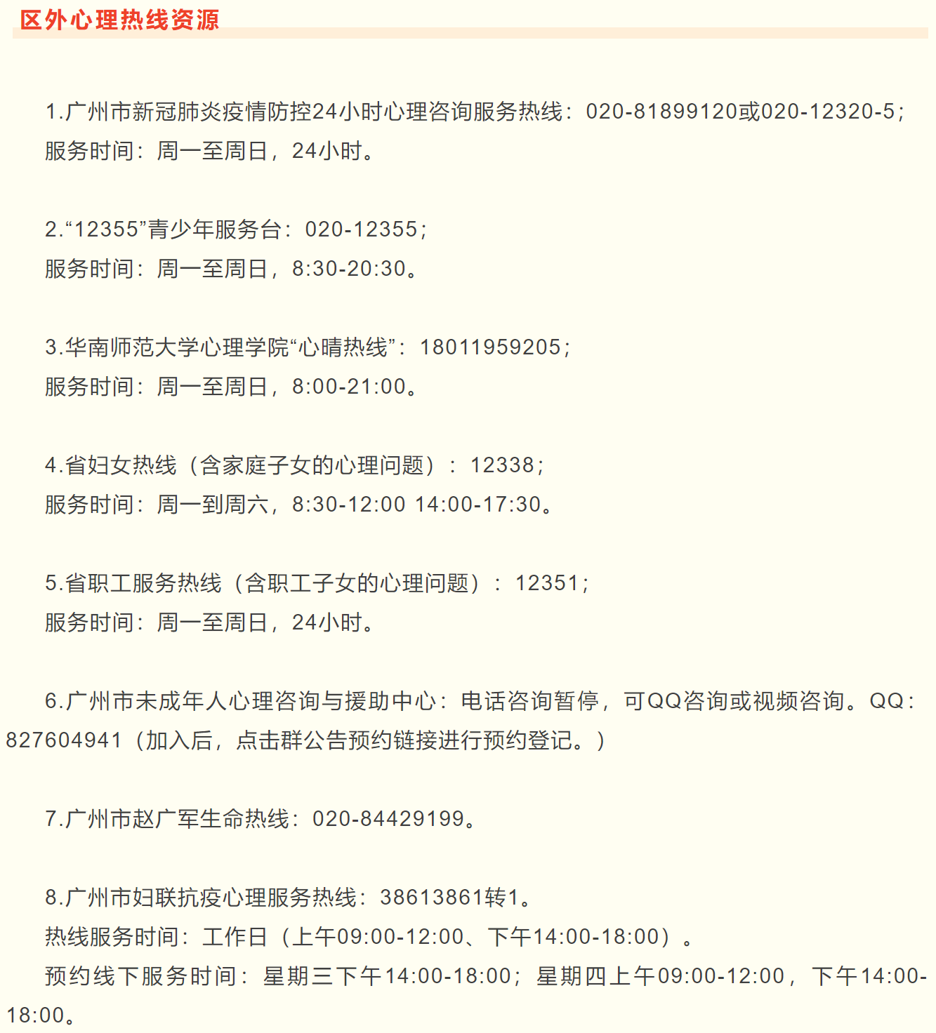 3.如有需要,请及时寻求专业帮助,关注“穗心家园”及“广州市未成年人心理咨询与援助中心”等公众号,还可以拨打心理支持热线(具体心理支持热线详见附件)。