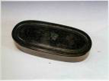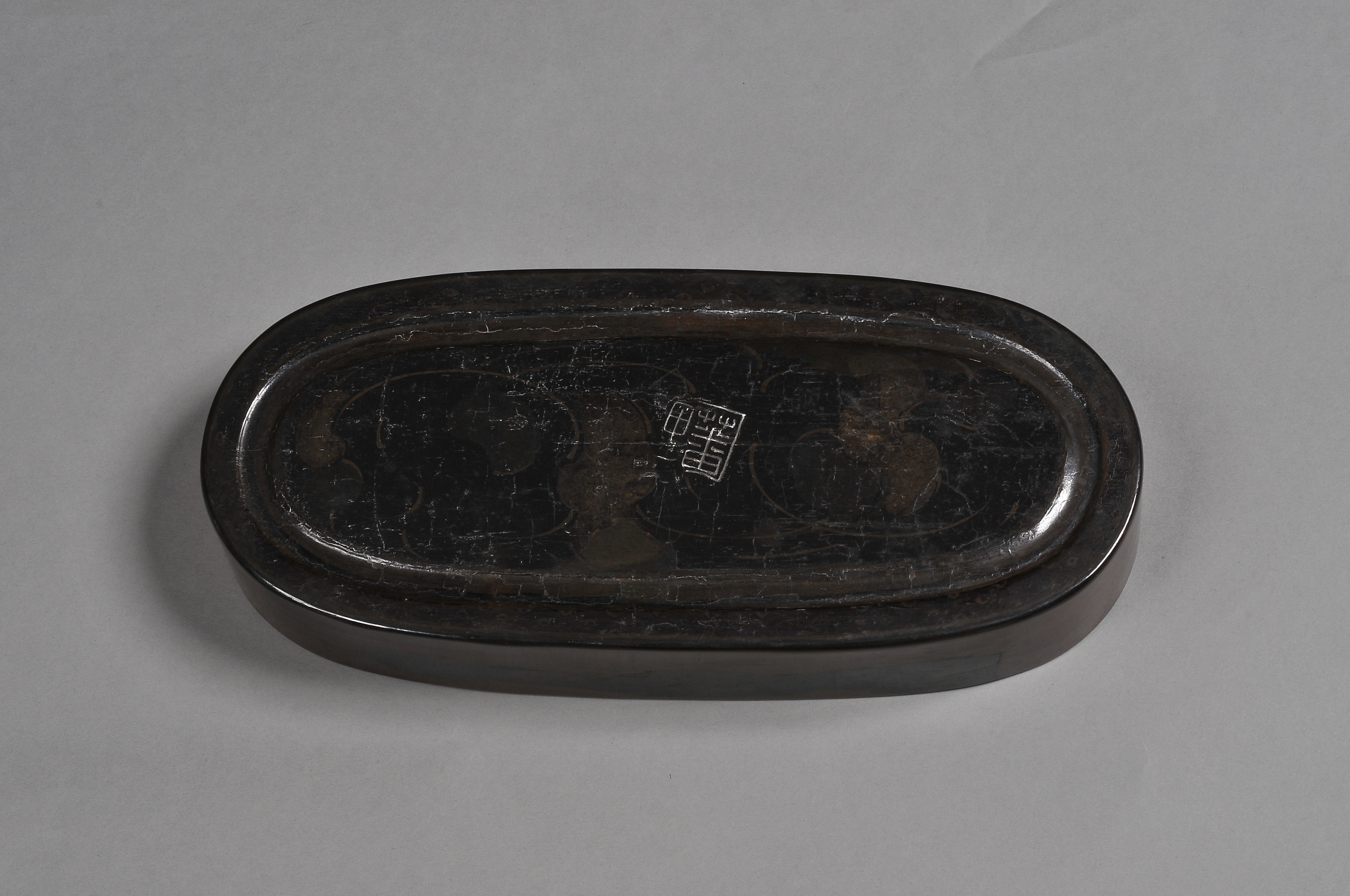 说明:石质细腻,紫蓝色,造型古朴,简练流畅,属唐代端砚精品。端州(今肇庆)从唐初开始生产端砚。据《石隐砚谈》记载:“端溪石始于唐武德之世。”唐代诗人李贺有“端州石工巧如神,踏天磨刀割紫云”诗句。该箕形砚为现存出土时间最早的一方唐代端砚,极为珍贵。