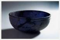 说明:碗呈深蓝色,半透明。内壁光滑如镜,外壁经打磨,呈毛玻璃状。据同位素X射线萤光分析鉴定,属于钠钙玻璃系统。可能是公元前1世纪地中海南岸罗马玻璃中心的产品。