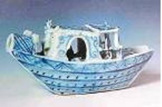 说明:景德镇窑产品。船身纹饰分别为点纹、三角纹、莲花纹和火球纹,火球纹在元代花纹中较为常见。青花颜色鲜艳,施釉不均,缩釉处的青花为褐色。在元代青花瓷器中,船形的器具较为少见,极为珍贵。