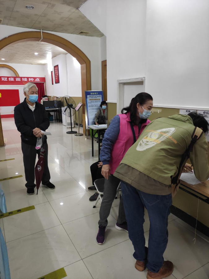 在疫苗接种现场,志愿者协助居民填写表格,维护现场秩序,测量体温等相关工作。