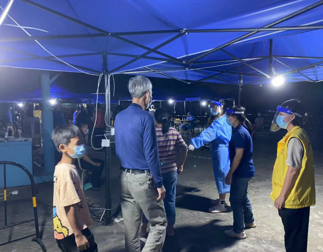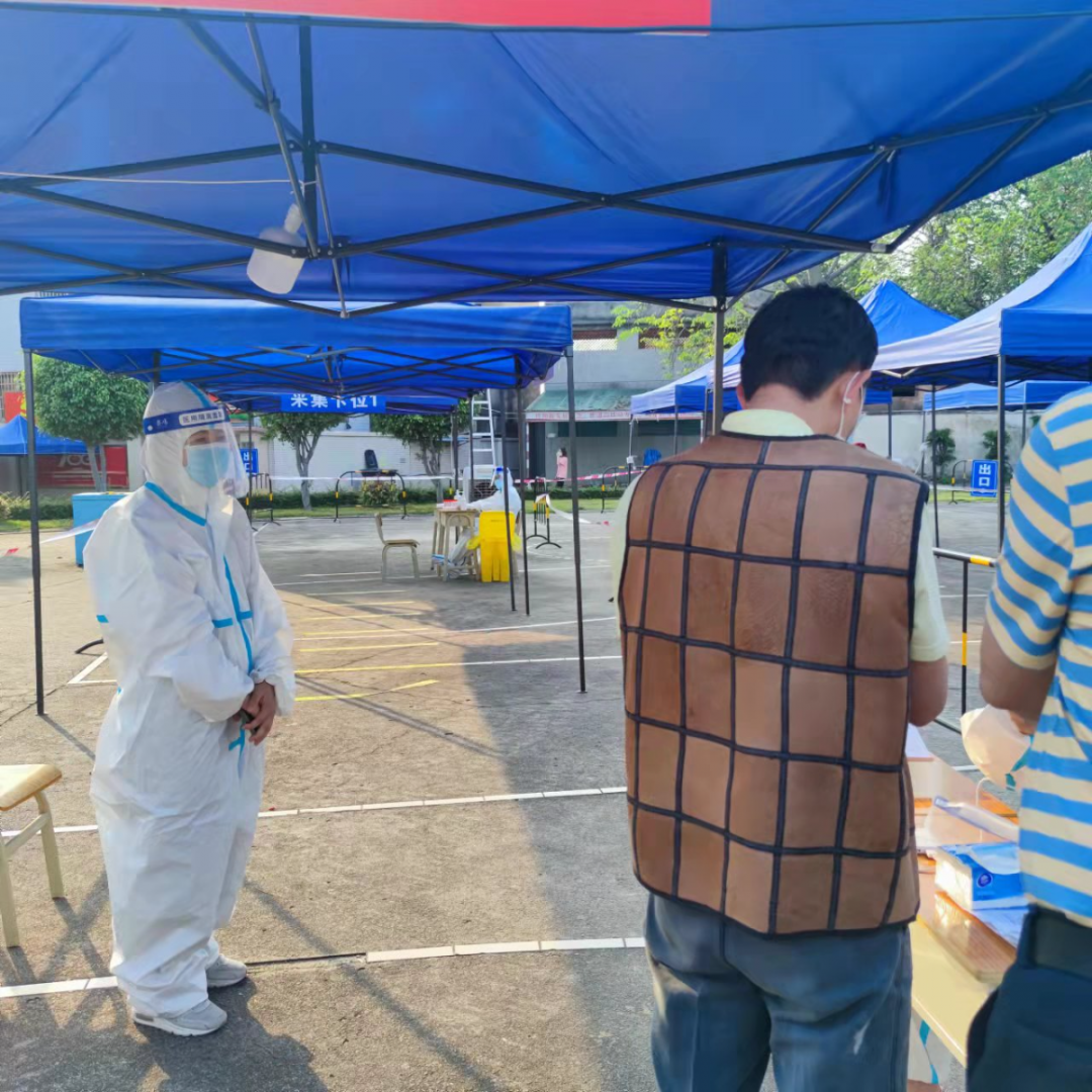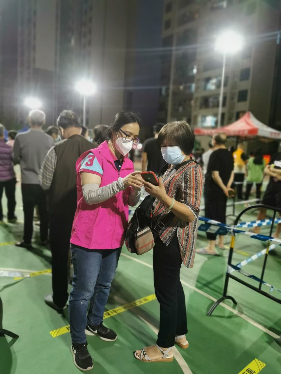 4月9日上午,新造社工林秀文、李晓仪早早就前往核酸检测点,参与准备工作,这一天,她们和医务人员、社区工作人员、志愿者一起,叮嘱前来参与检测的居民保持距离、扫码及登记信息,从早上忙到深夜。