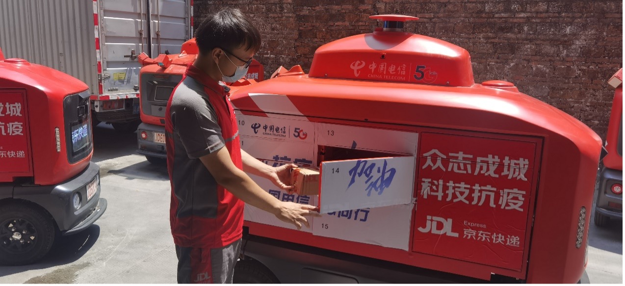 据了解,此次智能快递车的抗疫保供工作是京东物流携手中国电信广州分公司运营,投用的智能快递车在智能、高效、稳定方面有全面的升级,车身配备了激光雷达传感器视觉摄像头,通过中国电信5G网络实时传输信息,良好的5G网络让无人驾驶智能快递车畅通无阻;同时,配合先进的视觉算法高清地图,能实现自动避开障碍的高级别全自动驾驶。