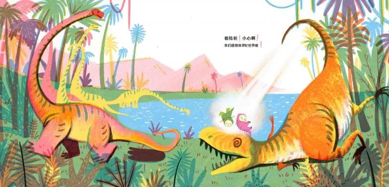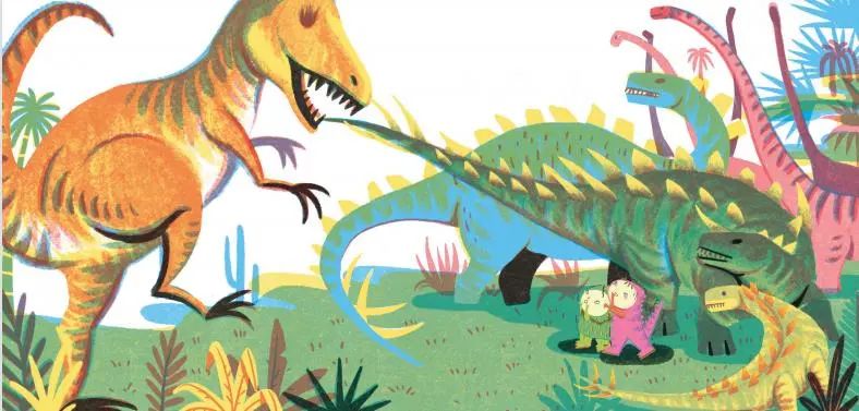 为了配合这场奇幻的恐龙世界大冒险,绘者制作了色彩明艳、童趣十足的插画,带孩子们回到植物蘩茂、温暖湿润的侏罗纪时期,探索神秘的恐龙世界。另外,还用大开页、折页的形式,将这些来自远古的庞然大物“装”进书中,为孩子带来直观的视觉冲击。