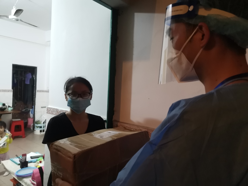 4月13日傍晚,物资配送小组组长李亮钧带领几名工作人员把杨女士的快递送上门。