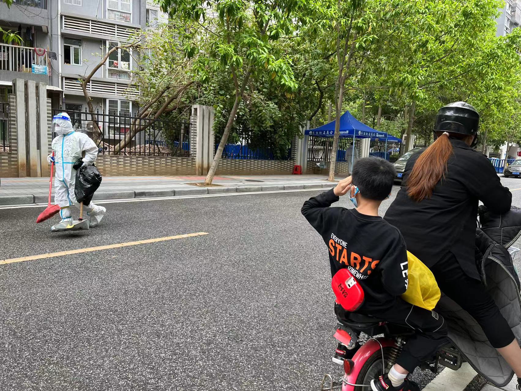(管控区域外,一名小孩向防疫工作人员敬礼致意)