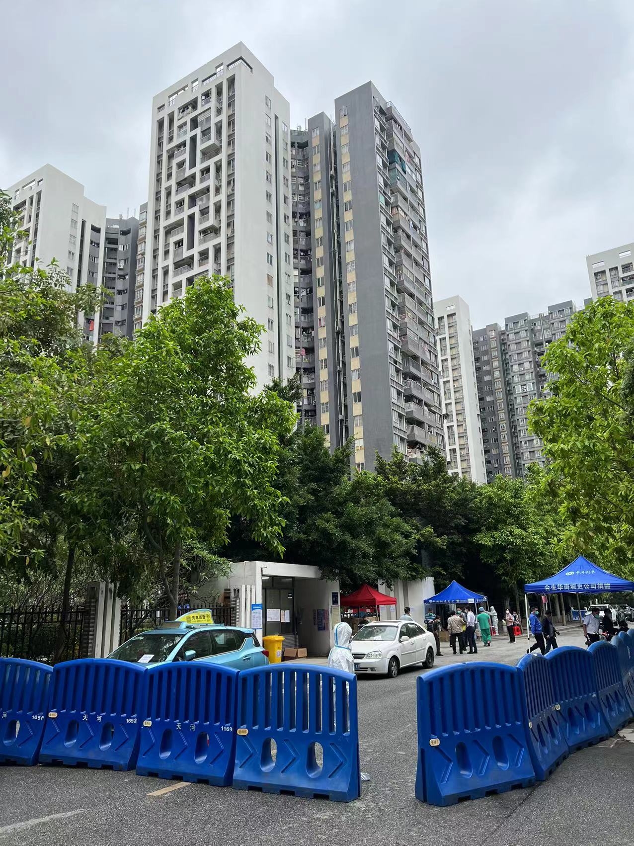 4月17日上午,记者来到位于车陂街道广氮北环街的封控区和管控区外,现场水马已经把管控区域围蔽,时间临近中午12点,电商平台配送员陆续将管控区域内的居民购买的物资送到小区门外。