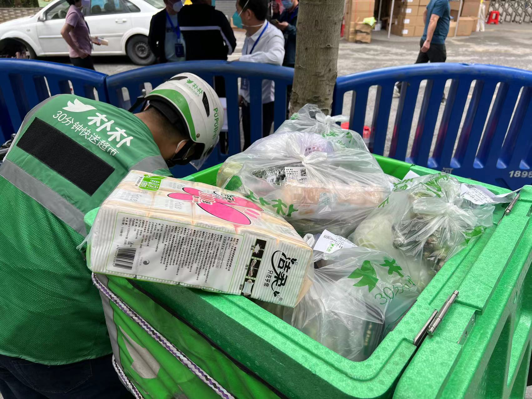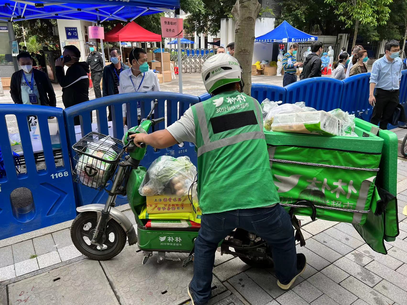 (上午11点,陆续有电商平台配送员送来物资)