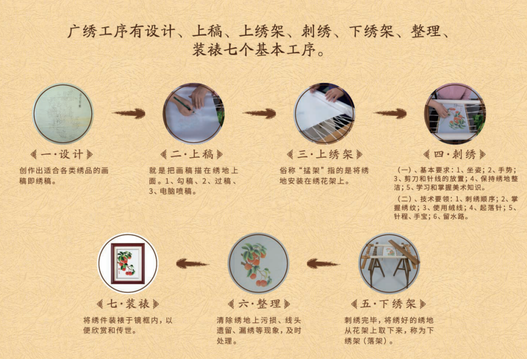 广绣刺绣技法有“钉、垫、拼、贴、缀”五种。广绣以构图饱满,形象传神,纹理清晰,色泽富丽,针法多样,善于变化的艺术特色而闻名。