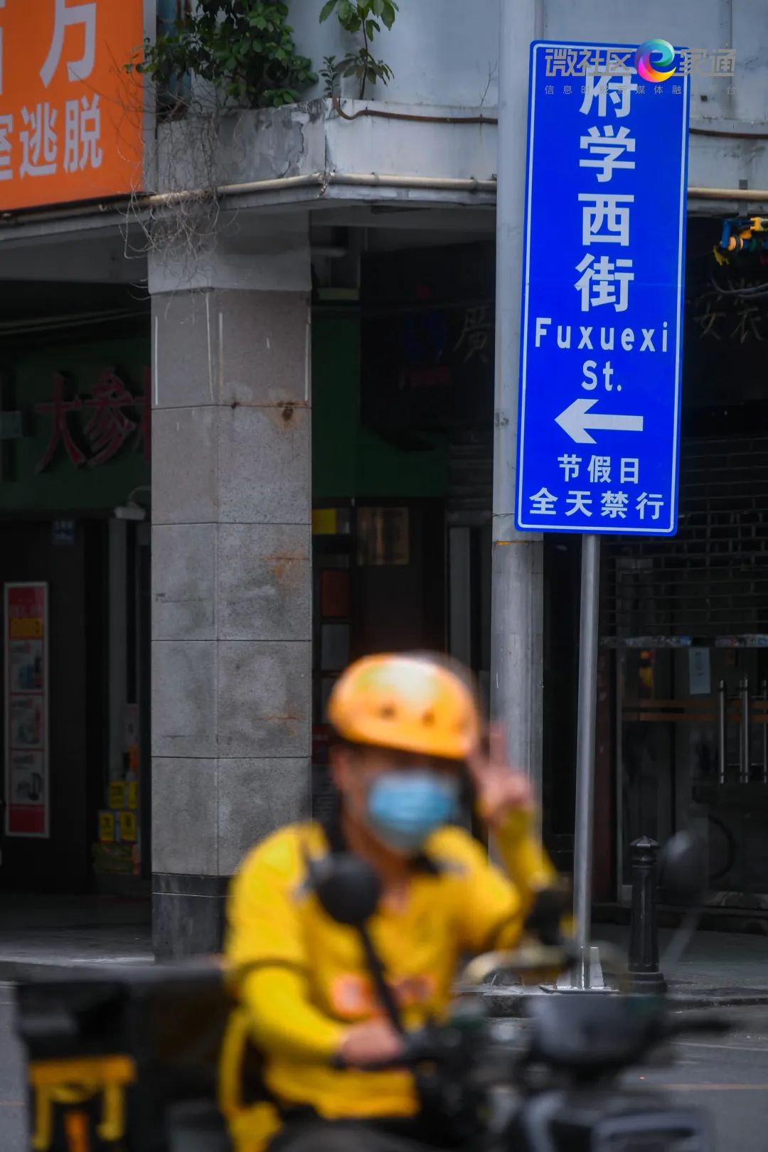 4月16日正逢周六,按计划,府学西街(圣贤里以南,金佰利广场停车场入口以北)也于当日试行节假日(双休日及全体公民放假的节日)步行化管理。记者走访发现,和北京路南段相似,在相应路口都有工作人员和志愿者进行交通指引,并贴有相关告示。