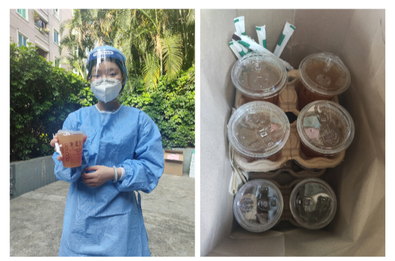 北京街辖内餐饮单位为府前路核酸检测点的防疫一线工作人员送上饮料,并用文字表达关心与支持。