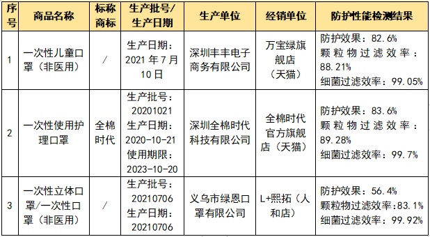 有3款样品明示标准为GB/T32610-2016《日常防护型口罩技术规范》,而该标准明确规定不适用于婴幼儿、儿童呼吸防护用品。