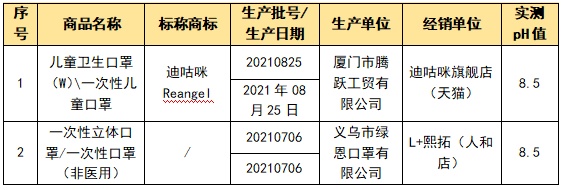 GB/T 3880-2020《儿童口罩技术规范》要求儿童口罩pH值应在4.0~7.5之间,有2款样品的pH值超出此范围,不建议儿童佩戴。标称商品涉及“迪咕咪Reangel”: