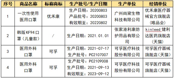 在耐用性测试中,4款样品不符合明示标准要求,未达到标准要求的拉力时,口罩带与口罩体连接处发生断裂,存在一定风险。标称商品涉及“优禾康”“可孚”: