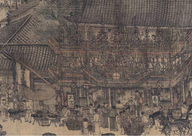 著名的《清明上河图》也有很多饮食场景,其中最著名的就是孙羊正店,顾客盈门。如果看细节就会发现,桌子上有一个叫注子的器皿,外面柱管放热水,里面放酒壶可以温黄酒。温一壶酒,三两知己,小酌谈笑,充满寻常生活的烟火气。