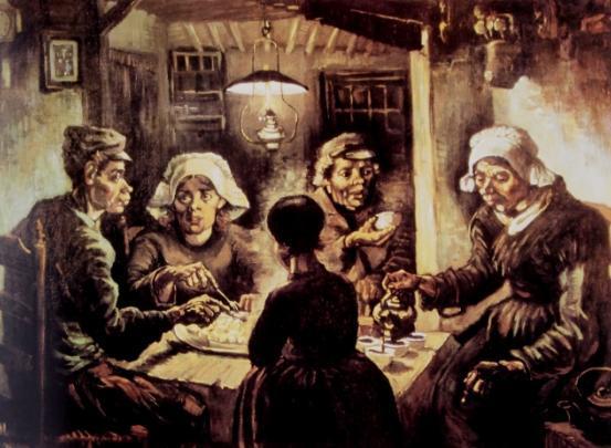 艺术品当然不仅仅只反映欧洲贵族们的生活,还能让我们看到社会的更多面,比如,19世纪前由于生产力低下,收获的庄稼和粮食难以维持温饱,农民和工人大多吃不饱。在梵高的名画《吃土豆的人》里,全家人的晚餐只有一点土豆,和贵族的生活形成了鲜明的对比。这正是梵高目睹了广大工人的艰难生活后用心创作的。