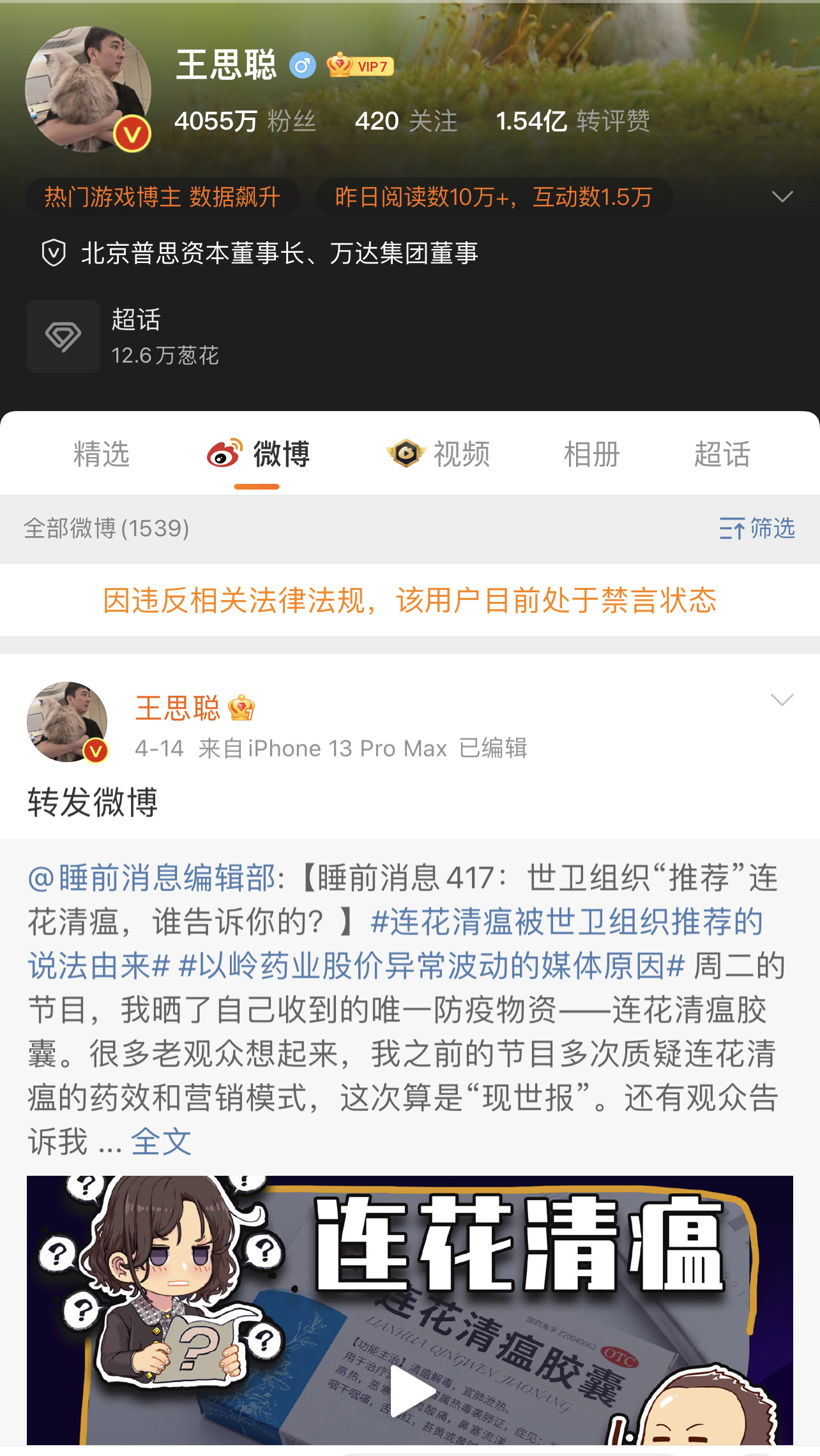 另外,据页面显示,王思聪是北京普思投资董事长、万达集团董事长。据了解,目前他的微博最新一条文章是4月14日转发“@睡前消息编辑部”的视频内容,该视频内容的标题是,世卫组织“推荐”莲花清瘟,谁告诉你的?