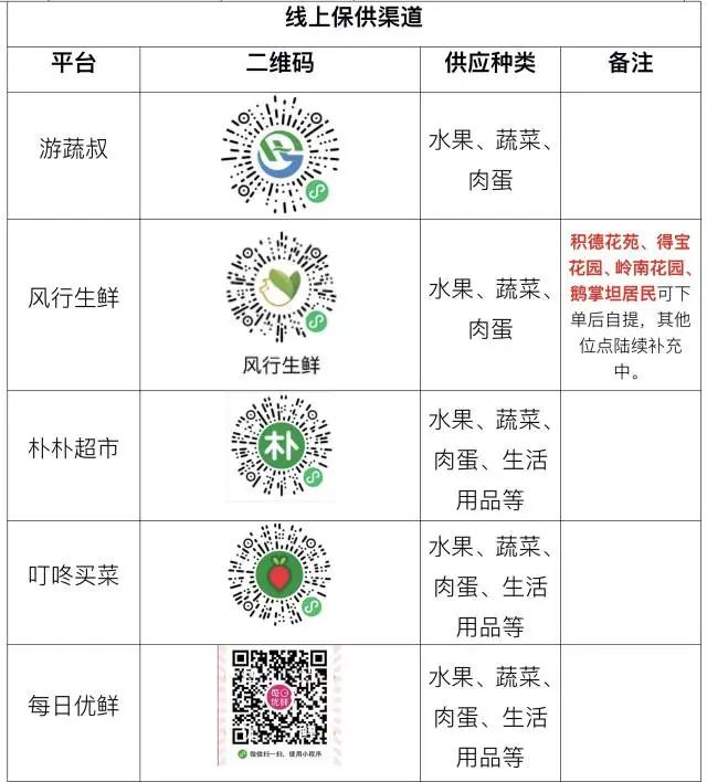 居民可通过线上平台实行“无接触”购买,通过扫描商家二维码,或进入线上平台下单购买,快递员将送货至各片区指定物品存放点,居民请在做好防护措施的情况下,尽快前往存放点提取。