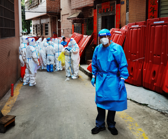 下沉社区至今,从晨光初亮到夕阳满天,每天都能在社区防疫工作中,看到李民涌的身影。这是一场对体力和意志的考验。开展大规模核酸检测时,一站就是好几个小时,身上的衣服湿了又干,干了再湿……上门排查时,多数区域楼户密集,没有电梯,只能一层楼一层楼的摸排,一户一户的询问……他和社区同志们、志愿者们一起穿梭在社区的各个角落,确保不漏一户,不漏一人。“老同志”的这种乐观、积极的态度也感染着身边的每一个年轻人。
