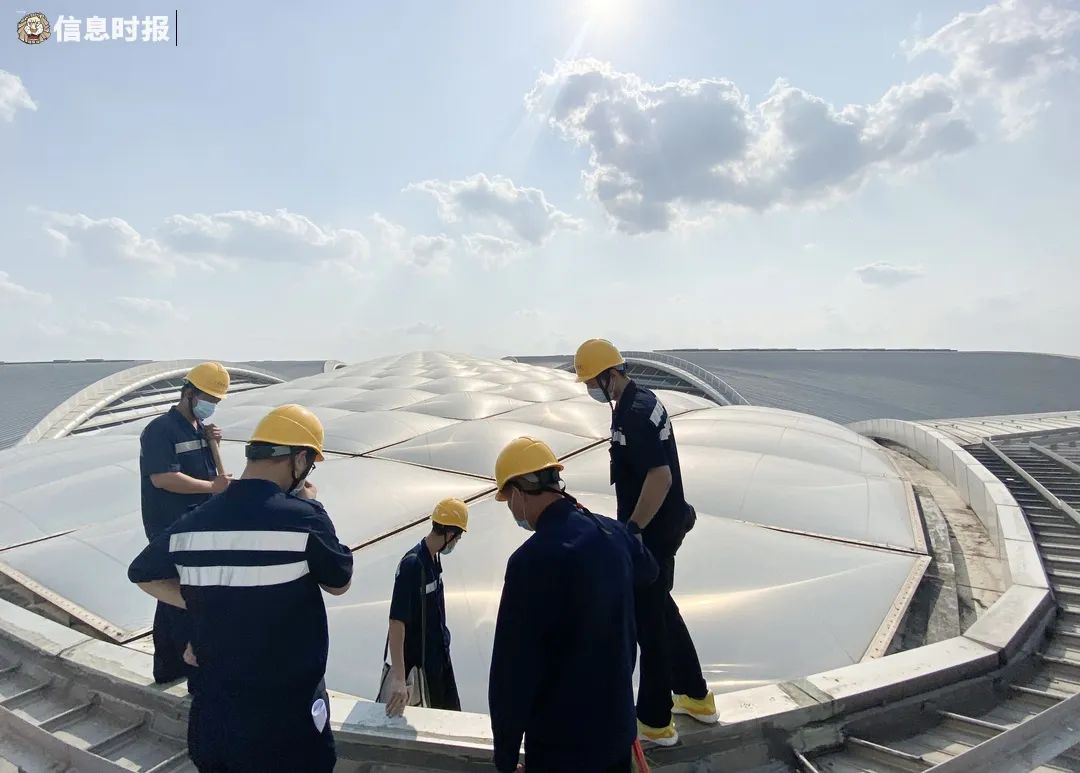 车间职工对屋顶气枕进行检修。信息时报记者 徐敏 摄