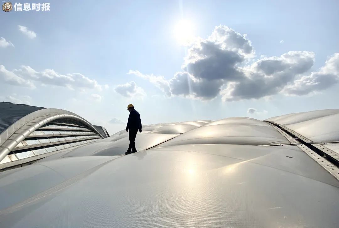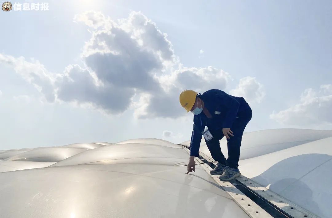 屋顶为拱形结构,最高点离地面52米,最低点47米,每次检修时,行走在斜面上,他们都必须格外小心。由于屋顶地势高、冬冷夏热,他们还需要应对不同季节温度的考验。除了检修养护气枕,他们的任务还包括检查金属屋面板、采光玻璃、打扫异物、清理水沟等。
