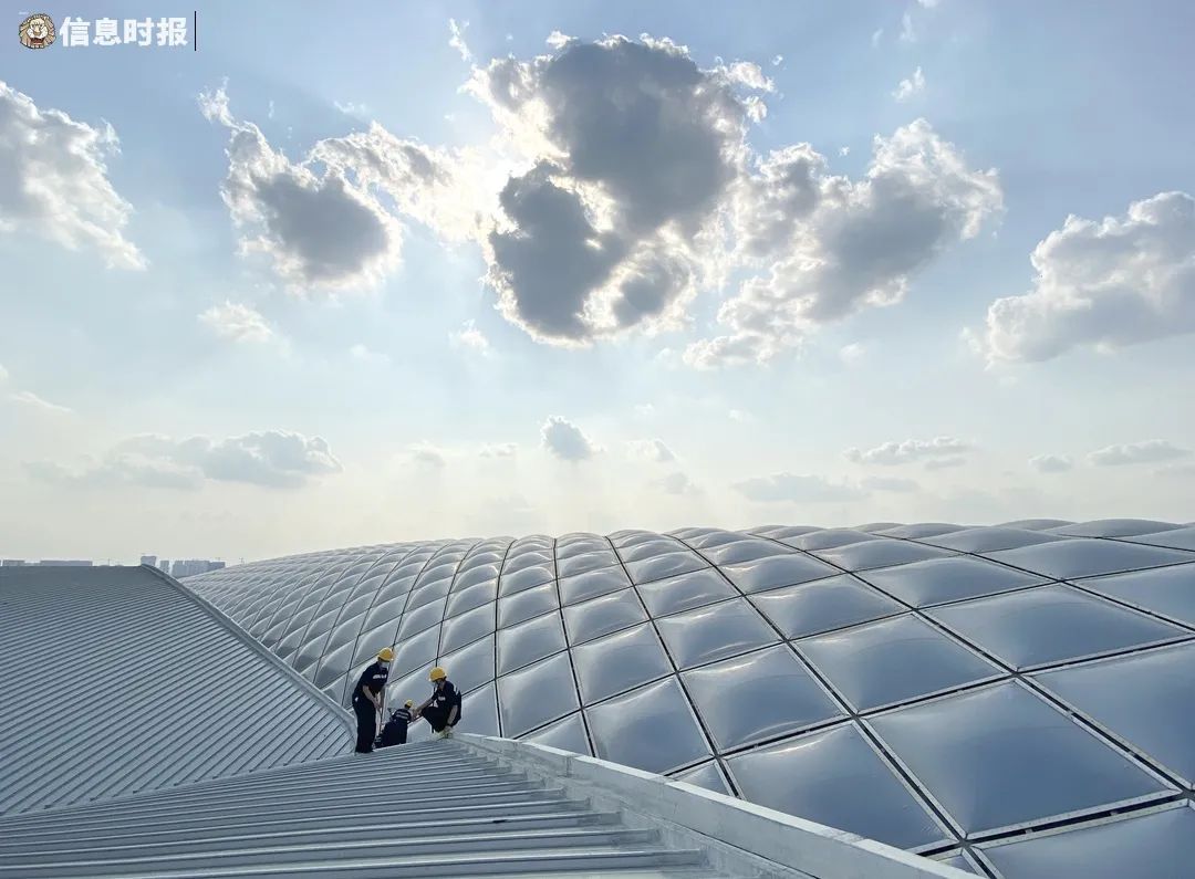 作为华南地区最繁忙的高铁站,广州南站的“高颜值”备受旅客喜爱。站房屋顶如同巨大的芭蕉叶片片上扬、层层递进。广州南站的屋顶设计独特,除了传统的采光玻璃外,还使用了透明ETFE膜材。每张膜内设一条充气管道,配置5台供气设备,气压不足时随时进行补气,以保持饱满鼓胀的状态,形成透明的气枕,实现良好的采光效果。