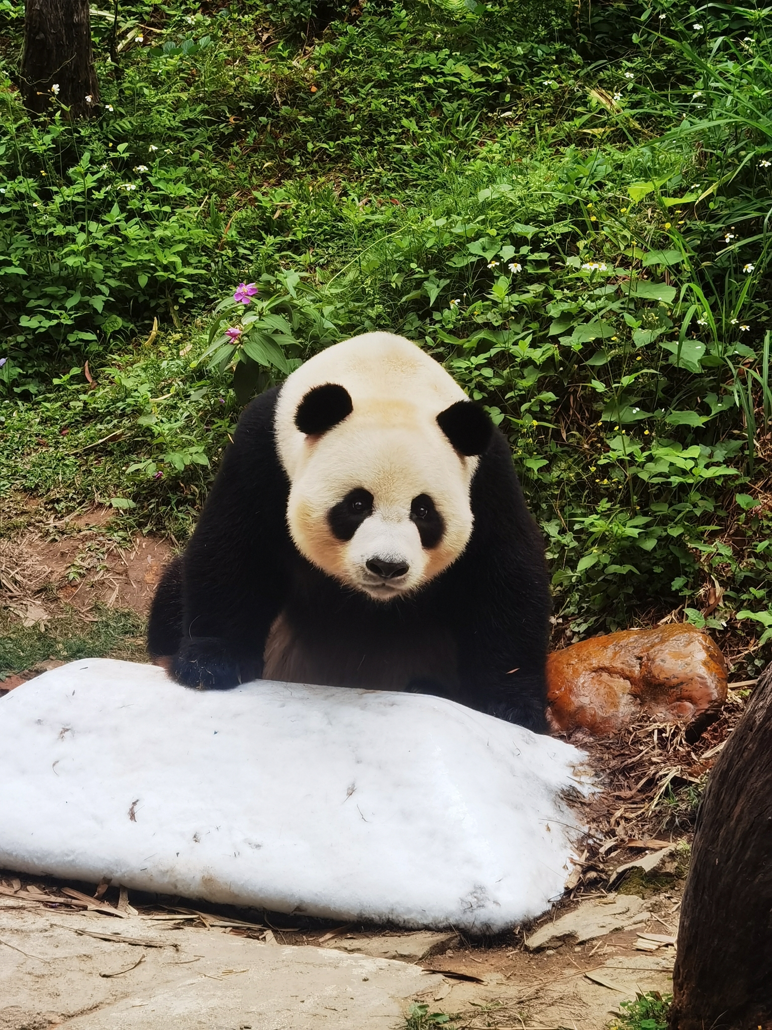 1、萌萌是女生,和弟弟们相比,它的体型最小,黑眼圈也最小。看它吃东西的样子,也是最文静的。萌萌平时不爱闹,都是安安静静地吃竹子、散步,体重保持在110-115公斤左右。