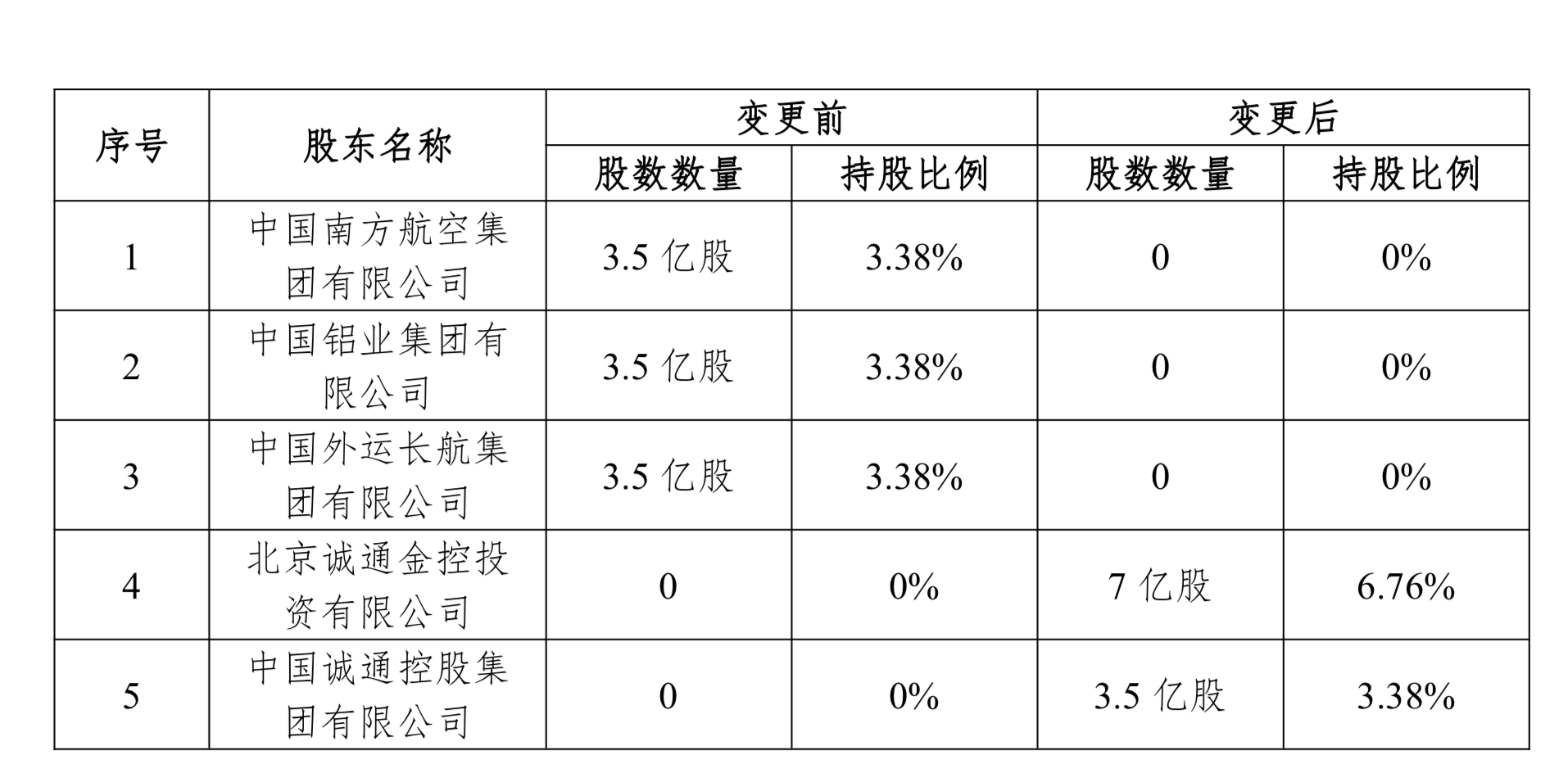 值得注意的是,4月15日,阳光保险集团突然发布关于变更股东有关情况的信息披露公告称,中国南方航空集团有限公司、中国铝业集团有限公司分别将其持有的3.5亿股(分别占比3.38%)划转至北京诚通金控投资有限公司;中国外运长航集团有限公司将其持有的3.5亿股(占比3.38%)划转至中国诚通控股集团有限公司。