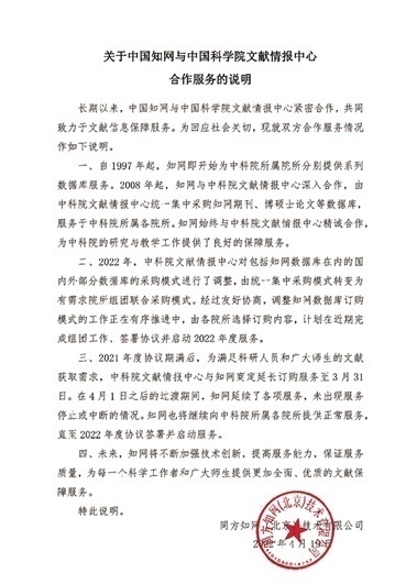 4月19日下午,知网发布《说明》称,2022年,中科院文献情报中心对包括知网数据库在内的国内外部分数据库的采购模式进行了调整,由统一集中采购模式转变为有需求院所组团联合采购模式。经过友好协商,调整知网数据库订购模式的工作正在有序推进中,由各院所选择订购内容,计划在近期完成组团工作、签署协议并启动2022年度服务。