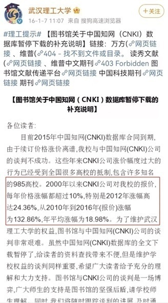 2016年1月7日,武汉理工大学曾就中国知网涨价问题发布过相关说明。武汉理工大学官方微博截图