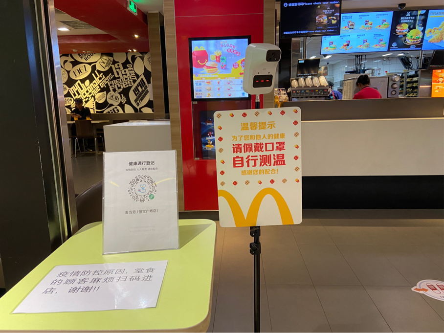 对于防疫举措,小e发现大部分餐厅都安排了服务人员在门口做好就餐人员登记,并在餐厅门口粘贴了通行码,要求就餐人员扫码登记、测温。此外,小e在麦当劳就餐时也发现,不少堂食客人在等餐或是吃完休息间隙,都会自觉戴好口罩。