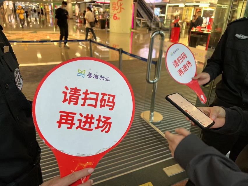 虽然人流量有所恢复,但是各大商场在防疫措施方面却没有放松。在天河城入口,保安人员严格检查进场市民的穗康码和行程卡并测温,确认无异常后方可进场。天环广场设置多个入口,每个入口都有保安人员检查进场人员的穗康码和行程卡并测温。“进入广场,请扫穗康码和出示行程卡,谢谢。”在正佳广场的各大入口,“大声公”也在提醒市民进场要遵守商场的防疫规定。