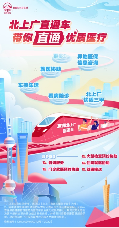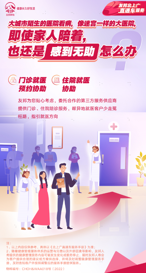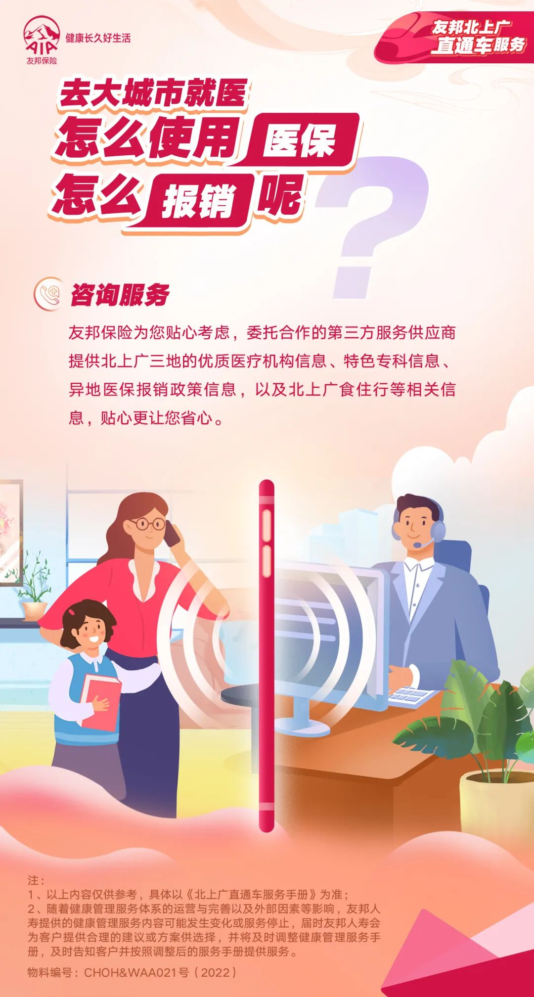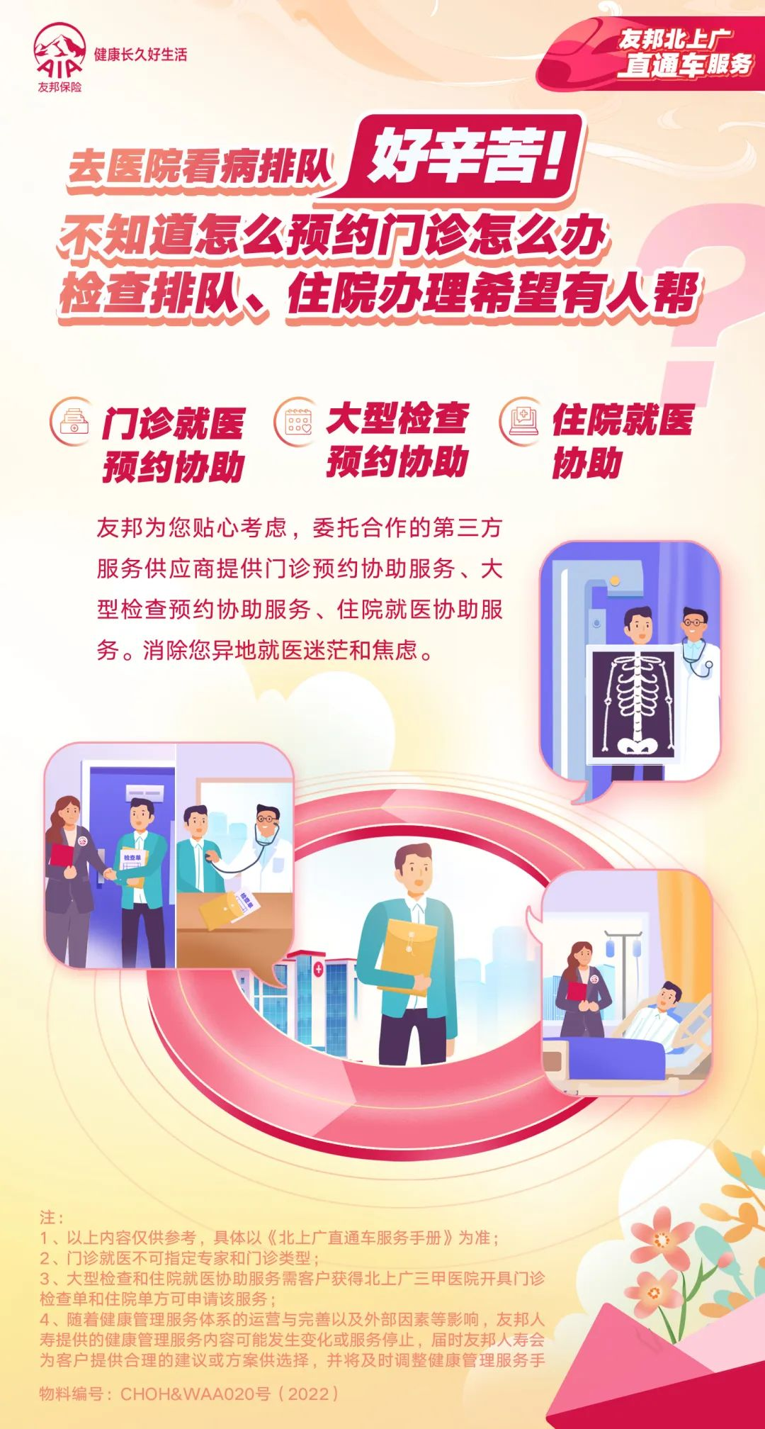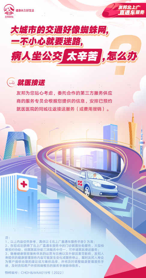非一线居民不想局限于本地医疗,如何获取北京、上海、广州等一线城市的优质医疗资源及服务?友邦保险于近日正式发布了 “北上广”直通车,提供咨询服务、门诊就医预约协助、大型检查预约协助、住院就医协助、就医接送“五大服务权益”,旨在为不同区域客户提供更多选择和优质的就医协助服务。友邦将通过优质医疗资源的便利对接,为客户解决异地就医的种种难题,打造全面无忧的就医体验,免除后顾之忧。