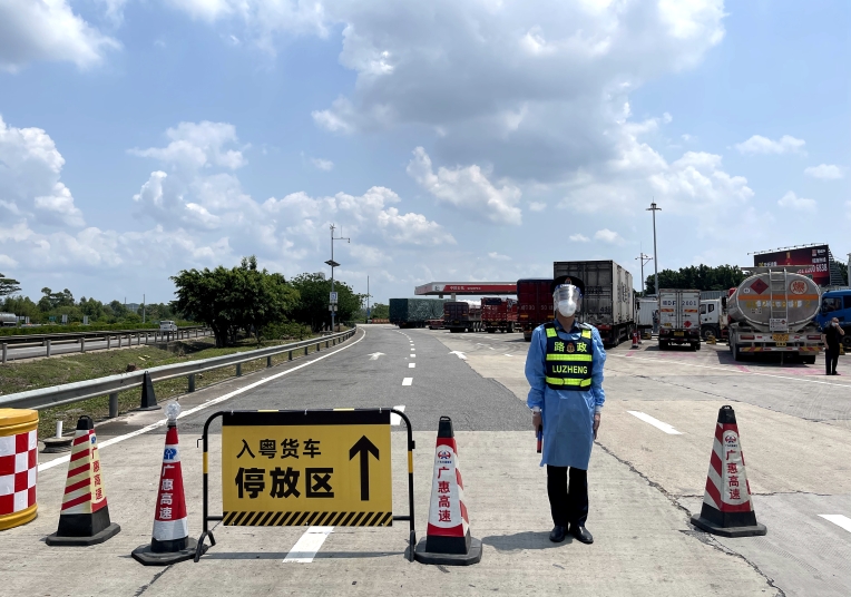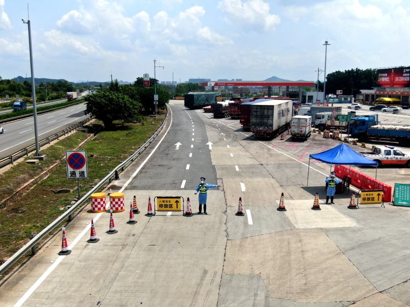 广州绕城高速南二环段在丹灶、勒流双向服务区设置入粤货车专区,实行24小时专班运作,引导车辆专区停放、使用专用休息区、卫生间,为货车司机开展测温、查码,提供免费热水、送餐服务。进入服务区,每辆货车均有路政人员指引。