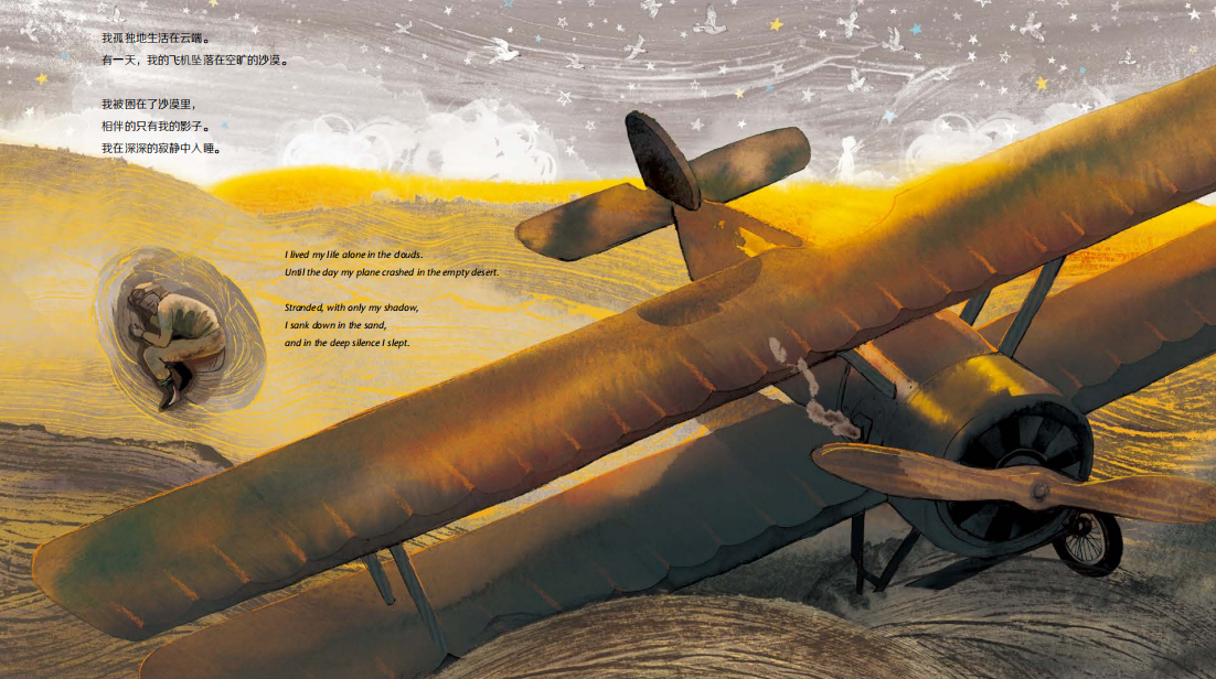 怎样让孩子感知到这样的氛围?马西尼是这样描绘的:荒无人烟的沙漠,一架占据半个画面的大飞机,飞行员蜷缩睡着,远处是淡灰色挂满星辰的天空。