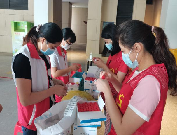 社工们严谨核对,给核酸试管贴码。