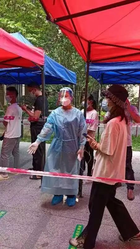 4月8日至12日,龙湖街颐康中心的社工们投入到何棠下村、腾飞社区、幸福誉社区、汤村村、大涵村等颐康站的大规模核酸检测工作中,负责布置场地、搭建帐篷、维持排队秩序、扫描粤核酸码等工作。协助采样后,社工们还主动配合社区或村进行入户登记和楼栋住户排查,电话通知未检住户,并与医护人员一起上门为行动不便的长者们检测核酸。